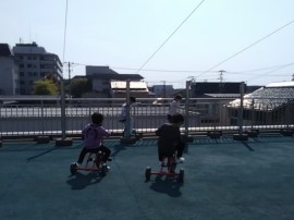 学校から帰ってきた新1年生の子どもたちは、屋上でのびのび遊んでいます。 |