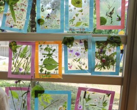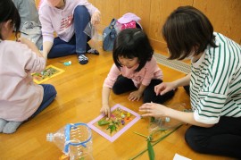 摘んできた葉っぱやお花で製作活動をしました。 |