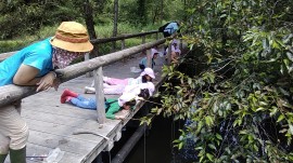 まずは、スタッフによる「ザリガニ劇場」で、‘池の生態系’や‘食物連鎖’について学びます。 |