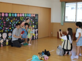 フォト・ブースでは、みんなの手形で作られた大輪の花火の前で記念撮影♪ |