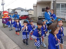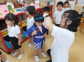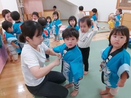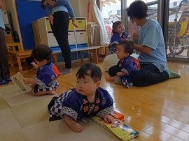 ちいさなミニトマト組(0歳児)さんも、法被姿でお祭りに参加します♪ |