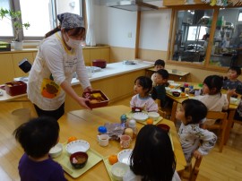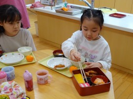そして、今日の給食は、鏡開きのお餅を使った『お雑煮』と、給食先生がこしらえてくれた『おせち料理』です! |