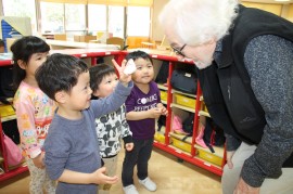 見慣れない容姿のお客様に子どもたちは興味津々。すぐにお客様の周りに集まって、あれこれ話しかけてみたり、いろんなものを見せて反応を期待したり。