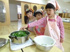 翌日、たいよう組さんが、みんなで摘んできたよもぎを使ってよもぎ団子作りに挑戦!