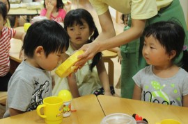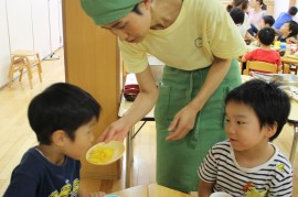 給食先生が、ことり組・はな組・たいよう組の子どもたちに